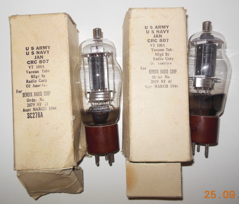 Живу в г. Калининграде, бывший Кёнигсберг. 25 сентября 2021 года на территории бывшего немецкого аэродрома в г. Пионерский (до 1945 г. - Neukuhren), это 30 км от Калининграда мною найдены две американские радиолампы. Обе лампы в идеальнейшем состоянии и готовы для использования сейчас. Сохранились даже фирменные коробочки к ним. На коробочках много надписей, в том числе и дата изготовления - март 1944 года и назначение - для армии и флота США. Маркировка на цоколях : JAN CRC-807 VT-100-A. Изготовлены на компании RCA (Radio Company of America).